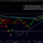 60 minute charts of theSPY and QQQ (S&P500 and Nasdaq 100 tracking etf’s). the SPY is approaching the typical point in a rising wedge patterns where breakdowns usually occur. the Q’s are in a well defined uptrend channel which is also getting a bit long in the tooth. for shorter term traders, a short signal would be triggered on a downside break of these patterns. another possibility that wouldn’t surprise me with the current momentum would be an overshoot of prices above the upper trendlines on these patterns. wedge and channel overshoots often immediately proceed sharp reversals and a break to the opposite side of the pattern/prevailing trend.