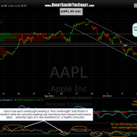 here’s the updated 60 minute chart on AAPL along with the one posted yesterday. so far, prices were rejected off the resistance zone and closed just below it, still unable to surmount and hold above the key 644 area. also note how the 60 minute macd is poised to make a bearish cross-over on any additional price weakness while the RSI is rolling down from overbought levels.