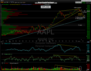 again, my expectation is that the selling will accelerate as we move lower in price but there will always be the typical counter-moves higher, especially in the early stages of a market reversal as the dip-buyers step in like Pavlov’s dogs to the dinner bell. here’s an updated daily chart of AAPL showing prices attempting to regain that 644 level (horizontal line) along with my primary and alternate scenarios (we either turn down around current levels or move up to re-test the wedge). again, how we close is more important than intraday levels IMO and although AAPL is the Big-Dog, we need to also keep an eye on the broad markets and other leading stocks as well.