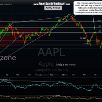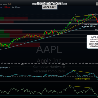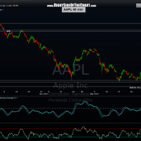 Here’s a look at AAPL on various time-frames from the weekly chart down to the 60 minute chart. The 500 level remains critical support although 490 is my official number (to allow a small margin of error for any brief spikes below 500 intended to run the stops on longs and suck in some shorts on a possible bear-trap). AAPL recently managed to regain that multi-year uptrend line on the daily & 2-day period charts during the 12/31- 1/2 rally but has fallen back below that level today. However, the 490-500 area remains critical support and for now, the stock remains comfortable above that level although AAPL has significantly lagged behind the broad market on the rally off the Nov 19th lows. Also note the bearish posture of AAPL below the key 200 & 50 day exponential moving averages (and the 40 period ema on the weekly chart).