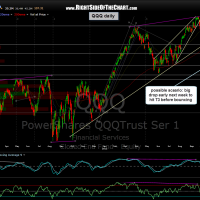 Although I see AAPL likely going higher soon to backtest that 574.75 area mentioned earlier, upon further review of the charts there is another scenario in which it does so: I could easily see AAPL, along with the broad market, gap down on Monday and drop about 2 1/2% or so, which would bring AAPL to my first target of around 522.30 as well as drawing the SPY to my first target zone (daily chart) and the QQQ to my third target (daily chart and/or 4 hour chart). In fact, although it’s almost a coin-toss decision between this and my earlier scenario (AAPL bouncing to the 574.75 before turning lower and reaching T1), I am leaning more towards this updated scenario and as such, have just closed out 1/2 my longs (for a very modest gain) and will likely sell the other half before the close.