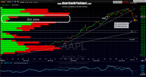 what we have here is that gap that i’ve been targeting as S1, which as i type, i notice that we’ve now actually just hit about a minute or so before the close. therefore, basically my downside support target has been hit (to the exact penny, as often happens). normally, i would expect AAPL to bounce off the first drop to that support level but in this case, we have a very pronounced thin zone immediately below this level on the volume at price histogram, which i often reference as one of my favorite charting tools. had things been reversed, and AAPL had been falling in a thin zone up to this point (gap support), with some very large vol at price bars just below that support level, then i would have put very high odds on a bounce.