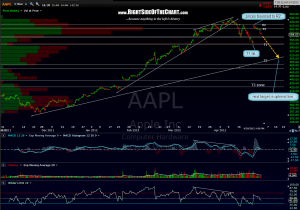 updated AAPL 120 min chart. primary scenario continues to favor additional downside to at least T2 but we still have a couple of support levels not far below to contend with. you might also want to revisit this post i made back in january just before AAPL’s previous earnings release. that gap and crap pattern did not play out after the jan earnings release but as the chart in this link shows, that was more the exception than the rule. also keep in mind that is a log scale chart over a 3 year time frame and covers a very large move in AAPL. therefore, those post-earnings gap-n-crap drops were more substantial than they might appear at a glance. technical analysis in it’s purest essence is all about using similar historical price patterns to order to forecast future price moves. like weather forecasting, there are a nearly infinite number of variables and it is far from an exact science but more often than not, similar patterns will lead to similar results as they have in the past.