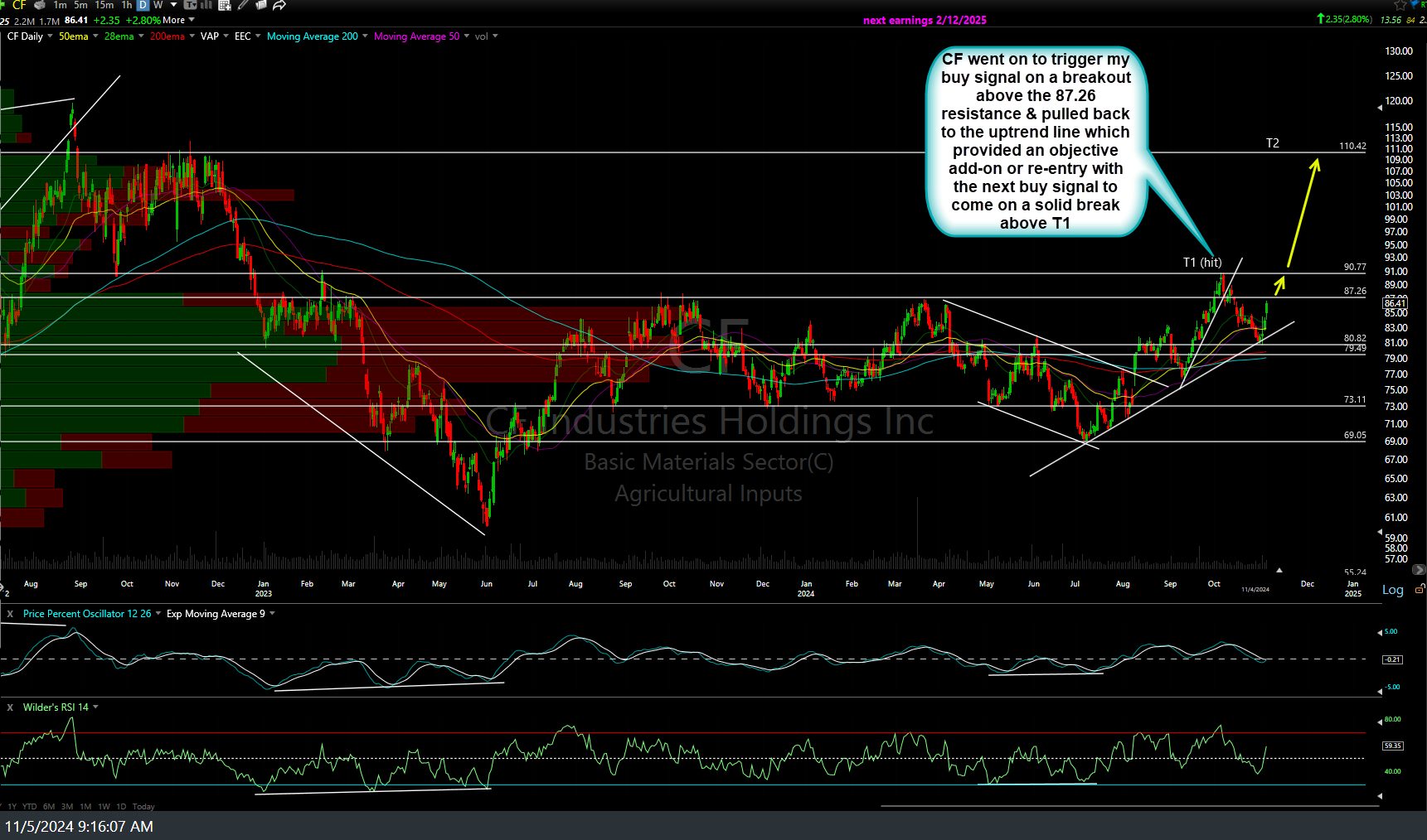 CF went on to trigger my buy signal on a breakout above the 87.26 resistance & pulled back to the uptrend line which provided an objective add-on or re-entry with the next buy signal to come on a solid break above T1.
