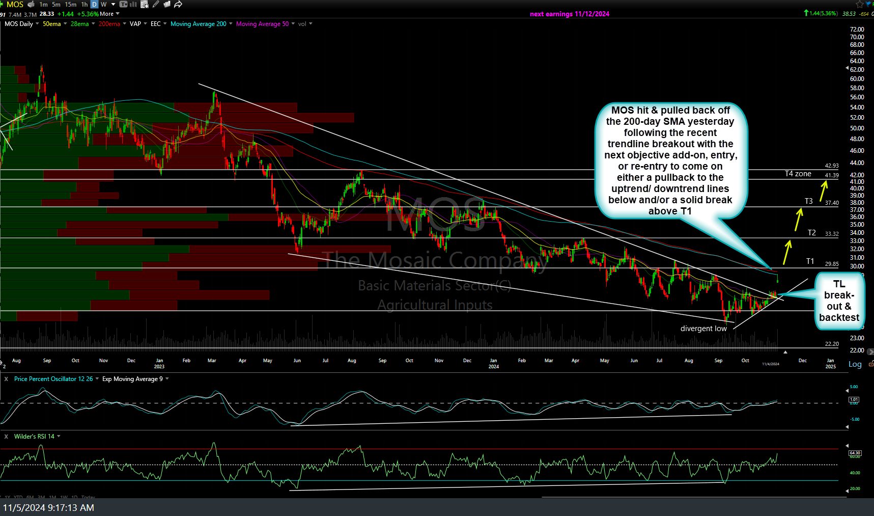 MOS hit & pulled back off the 200-day SMA yesterday following the recent trendline breakout with the next objective add-on, entry, or re-entry to come on either a pullback to the uptrend/ downtrend lines below and/or a solid break above T1.