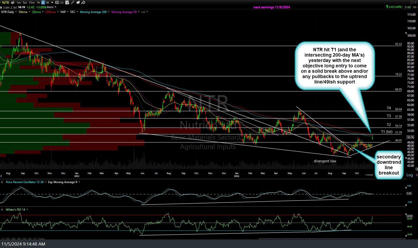 NTR hit T1 (and the intersecting 200-day MA’s) yesterday with the next objective long entry to come on a solid break above and/or any pullbacks to the uptrend line/49ish support.