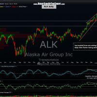 ALK will trigger a short entry on a break below the rising wedge pattern on this 4-hour period chart. At this time, my preferred target is T1 as the primary trend is still bullish and as such, this will be viewed as a counter-trend, pullback trade. However, this trade is very likely to be extended to a longer term swing trade targeting T2 or quite likely the longer term swing targets shown on the daily and weekly charts below.