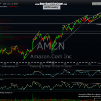 Sometimes this strategy will put you on the wrong side of a gap and occasionally by a level that exceeds your predetermined stop by a wide margin. Therefore, always trade and adjust your position sizes according to your own personal risk tolerance and trading or investing style. Here are the updated daily & weekly charts for AMZN and as this stock is prone to sizable gaps following it’s earnings reports, these charts will most likely have changed considerably tomorrow. If the stock is indicated to gap above the previous suggested stop criteria of 290.50 tomorrow morning, I will try to post an update on my exit strategy before the bell tomorrow.