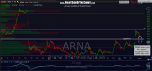 the ARNA set-up posted last night fell back to the top of support this morning, providing an possible long entry, but just kept on going and sliced right thru the bottom support line, triggering the suggested stop. this will now be taken off as a set-up and moved to the completed trade category.