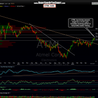 My preferred target at this time is T3 (8.20). I’ve been watching ATML fall pennies shy of T2 for the last couple of weeks and after falling shy of that target level (resistance), the stock would fall back to the first target area (former resistance, now support). Essentially that is bullish price action, as the stock was consolidating for the last couple of weeks which helped to alleviate the overbought conditions which formed following the initial breakout (a move over the downtrend line/6.80 level). Therefore, one would now expect the T2 level/7.70-7.50 area to act as support on any pullbacks. Zooming into the intraday charts, my preference is to raise my stops to the 7.25 area.