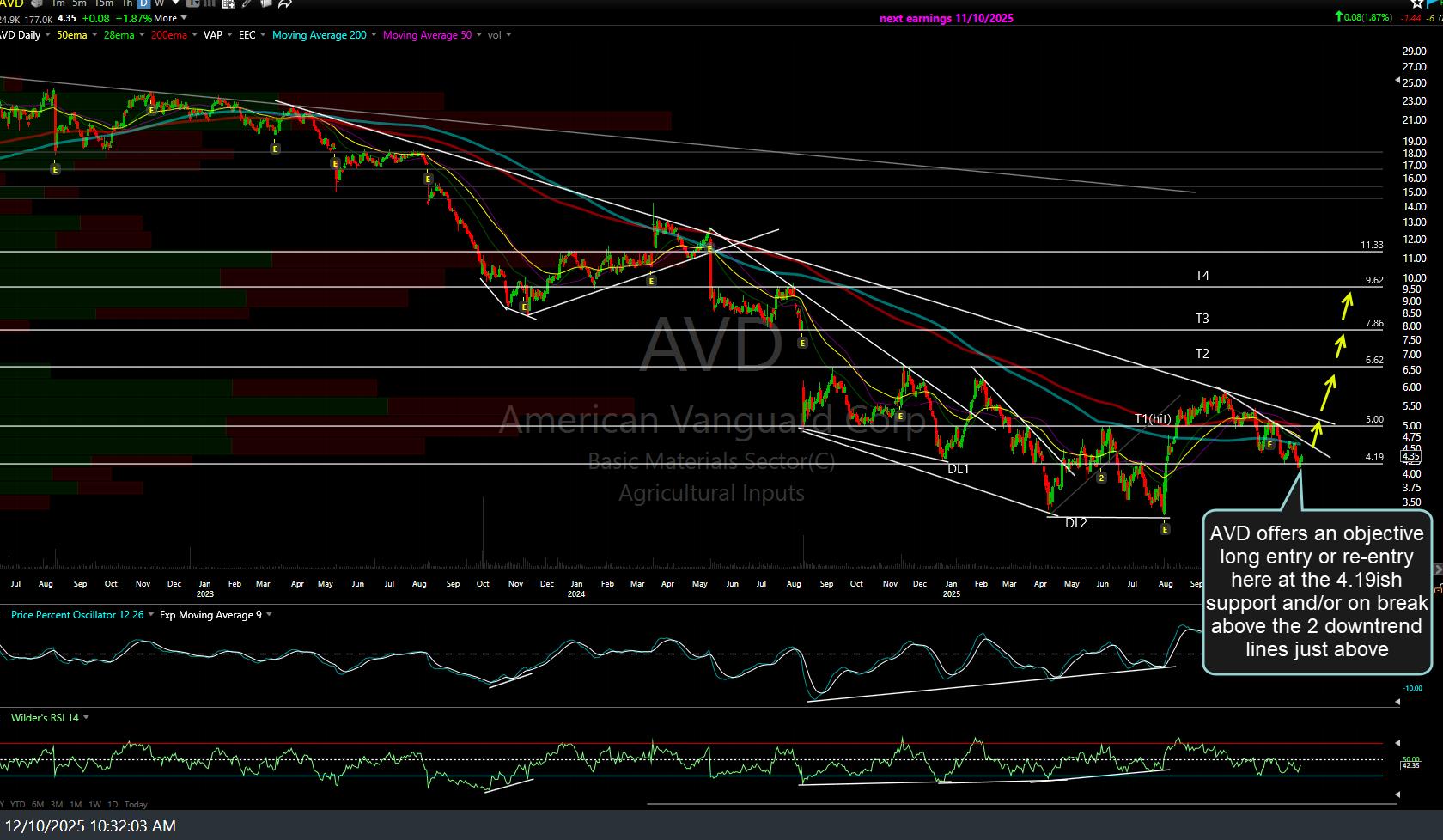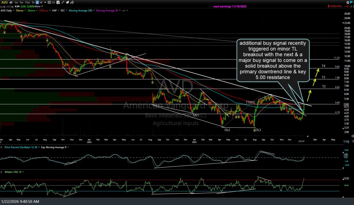 AVD is one of several swing trades & long-term trend trades in the agricultural inputs sector, which continues to appear to have started the next leg up following the corrective wave of profit taking that came after many of those trades hit price targets (resistance) with divergent highs & overbought conditions. As per previous videos, AVD is one of the smaller, more aggressive ag input stocks and, as such, considerations should be made to adjust one’s position size down to account for the above-average gain & loss potential (the final target, T4, is 90% above the primary downtrend line, which is currently being tested).