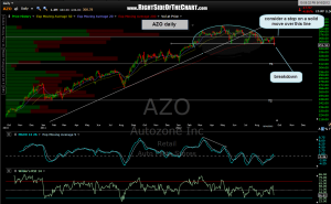 here’s the updated chart on the AZO short. prices moved sideways out of the originally posted rounded top pattern after giving a false-breakdown and it did run up to test that resistance area that i mentioned in the last update but was unable to make a solid move above it. AZO triggered a fake-down (false breakdown) on an intraday break a few weeks back but prices closed back above that support line that same day. however, on friday, we had a nice fat bearish engulfing candlestick that finally gave us a close below the support line so this one looks good… very good if we get any additional downside and a negative close tomorrow.