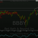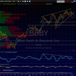 BBBY was recently posted as a short but was premature as although the gap down below the smaller wedge was a breakdown (and quite a large move down), i should have recognized earlier this primary uptrend line that i have since added to the daily chart. make sure to note that clean negative divergence on the indicators below as well as on this weekly chart. the first chart is the original, showing my oversight and failure to recognize that uptrend line before posted the trade idea on such a large gap down so close to a potential key support level. however, if anyone happened to take it and endured the appx 7.5% loss (from entry to where BBBY bounced back to put in that nice triple-top potential topping pattern, which might not have violated many longer-term swing trader’s stop parameters), you should now be back close to entry and might considered adding (or re-shorting if you stopped out above entry) once that primary uptrend line, which is also the larger wedge pattern, breaks down. first chart is the original daily chart, the next two are the updated daily and weekly charts.