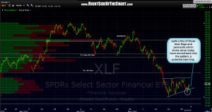 so far today i’ve seen a lot of those recent bear-flags and pennants breakdown today only to have prices snap back up inside the pattern, which creates a potential bear-trap. some of that patterns are still in play with prices re-testing or close to re-testing from underneath but this is something to continue to monitor. we still have some potentially market moving economic reports out tomorrow so best to keep things light for now since the markets are very whippy right now. personally, i’ve taken some long hedges which i might add to or remove depending on how the market trades tomorrow morning. XLF 60 minute chart shown.