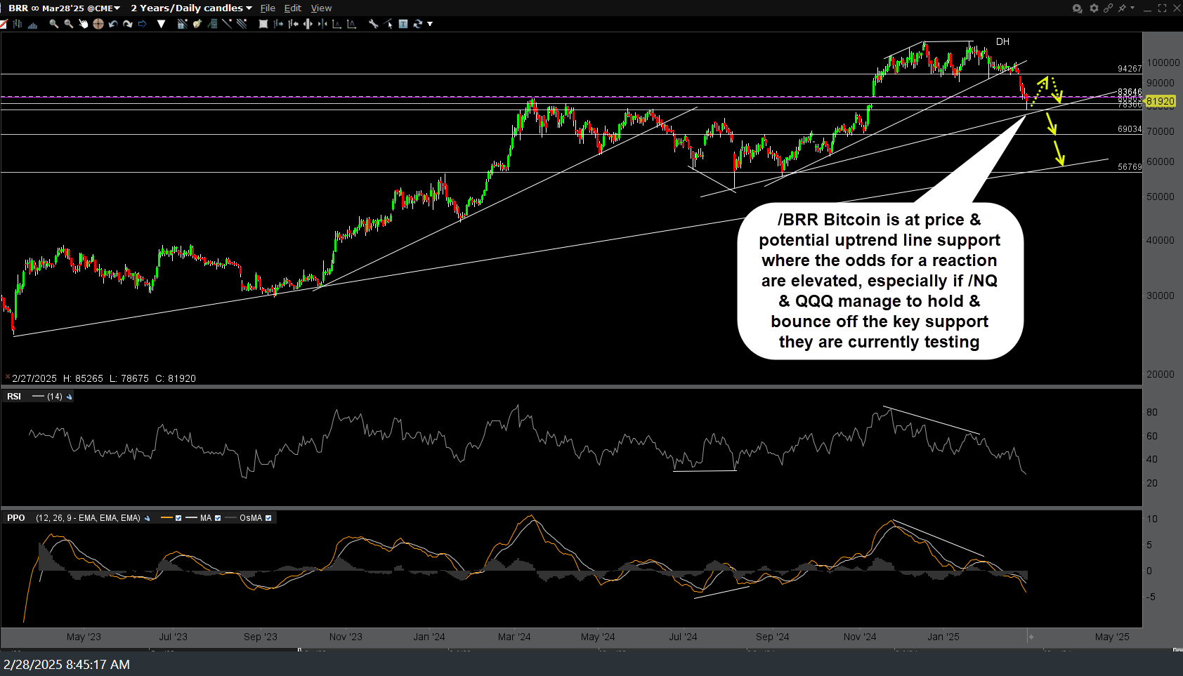 IBIT (Bitcoin ETF) or /BRR (Bitcoin futures, or /MBT micro bitcoin futures) offers another objective reversal (close Friday’s bounce long for the quick 20% gain & go back to short for the next leg down) here at the bounce targets posted on Friday. Previous (Friday’s) 60-minute charts of IBIT & daily chart of /BRR below.
