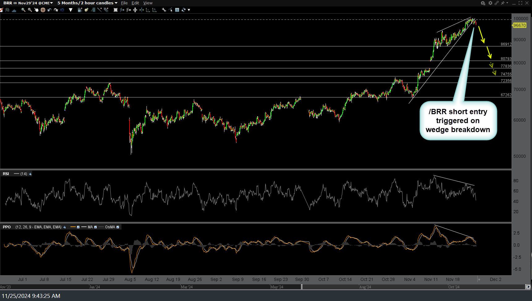 /BRR (Bitcoin futures) and IBIT (Bitcoin ETF) have triggered a short entry on breakdowns below the bearish rising wedge patterns that were posted on Friday. Updated 120-minute & 60-minute charts below.