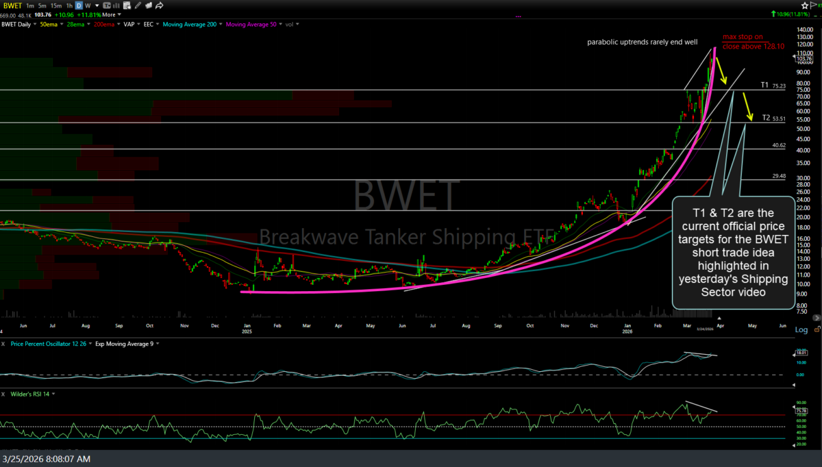 The following daily chart lists the two current official price targets (T1 & T2) for the BWET (Breakwave Tanks Shipping ETF) short trade idea highlighted here in yesterday’s Shipping Sector video. The additional lower support levels mentioned as potential targets are only that (potential), at this time, but may be added as official price targets, depending on how the charts develop going forward. The maximum suggested stop (if targeting T2) is any daily close above 128.10 or lower, if only targeting T1.