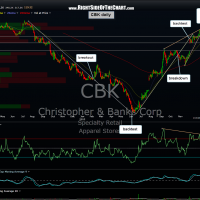 Barring any gap of more than 3% in either direction, I will be adding CBK as an active short trade at the open tomorrow. As seen in the daily chart below, CBK has recently broken down from a bearish rising wedge pattern and while the stock was down big earlier in the trading session today, it managed to recoup a good percentage of it’s losses and close at a level which still offers an objective entry even for shorter-term/active traders targeting T1. As small as that distance looks when eyeballing the chart, keep in mind that CBK has put in a monster run of well over 500% since bottoming just 7 months ago. In fact, T1 is about 10% below current levels.