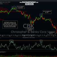 Zooming out to the weekly chart, we can see that CBK has a history of getting ahead of itself during uptrends, as noted by the 3 extreme RSI readings over the last decade. The previous two readings of such levels (77+) have both lead to drops of over 90% in the stock (yes, 90%+ drops) although right now my preferred swing target is T3 (3.80), which would be a drop of 31.8% from current levels (although the $2.00 area is a possibility for an additional target if things start to get ugly in the broad markets). Since the entry price is yet to be determined, I will post some suggested stops tomorrow. However, as a general rule, consider a stop with at least a 3:1 R/R to your preferred target.