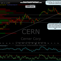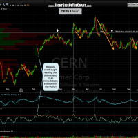 note how 4 out of the last 5 (80%) RSI 70+ (overbought) readings on that time frame have immediately lead to substantial corrections (the 5th did lead to a quick, but rather shallow pullback with prices quickly continuing higher. CERN would also offer a very nice R/R on a new short or add-on at current levels using the 78.60+ stop level ($1.60 downside vs. about $12.50 profit to T1 and a $19 profit to T2). i can’t promise the trade will work out but i can say that the R/R (risk vs. reward) on a trade doesn’t get much better than that, at nearly 12:1 to T2.