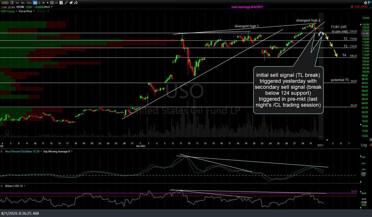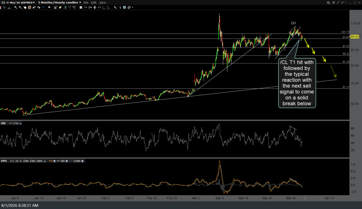 /CL (crude futures or /QM, /MCL, etc) first price target (T1) hit in the overnight & early morning session, followed by the typical reaction with the next sell signal to come on a solid break below. Previous & updated 60-minute charts of /CL below.