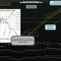 also note that i pointed out this very odd (unnatural) price action immediately preceding the top in CMG. there’s usually a price to pay for stock manipulation & this looked like some type of programmed trading executed short-squeeze IMO. if so, then the stock should continue to tumble as the manipulators have already squeeze out the majority of the only guaranteed buyers of CMG (shorts MUST cover/buy at some point where as longs/bulls can decide to just stay away). updated daily chart, previous two weekly charts & updated weekly chart: