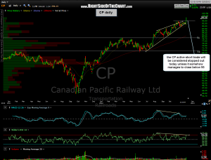 The active CP short was based off the daily chart and will almost certainly close above the recent high of 94.83, thereby triggering the suggested stop on this trade. Therefore, barring any crazy reversal into the close and a move back below at least the 95 area, CP will be considered stopped out and moved to the completed trades category after the closing bell today.