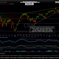 Also note that I have slightly redrawn the pattern on the daily chart and since the short entry just over two weeks ago, prices have twice kissed that key horizontal support level and are currently clinging to it as I type. With both the MACD & RSI clearly pointing lower, I’d say that the odds of prices breaking below this support level soon are good to excellent and with a stratospheric p/e ratio of 683, CRM has very little margin for error. If so, any solid break below this support level (the 40.00 area) would trigger an objective add-on or new short entry for CRM. Updated daily & weekly charts: