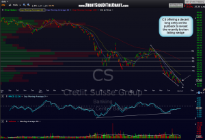 the CS long set-up posted after the close yesterday is offering an objective long-side entry on this pullback as it re-tests the recently broken bullish falling wedge. again, i consider this an aggressive trade as CS is flirting with making a new all-time low. do not become complacent with your stops if you decide to take this one. i prefer a gradual scale-in with this trade vs. taking a full-position here as it may want to dip lower before moving higher, possibly even spike under the recent lows once more before moving up. i started with a small initial position here and set a liberal stop at 16.81.
