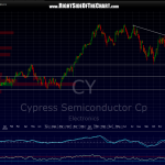 CY was posted in monday’s trade ideas video as a new short set-up. the stock broke support the following day, triggering a short entry and today it re-tested that support from below and closed right on it, offering a second, very objective short entry. a tight stop would be on a solid close or decent intraday move back above that resistance line while a more liberal stop (my preference) would be above the 14.30 level. first two charts are daily charts (monday’s & today’s) while the third chart is a 2-day period chart showing the targets.