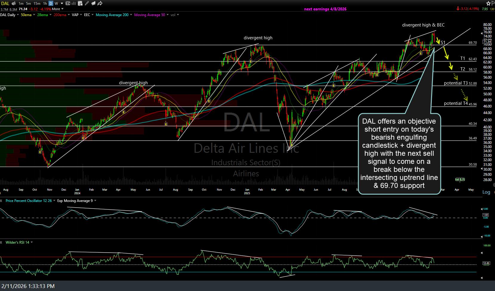 DAL has hit T1 & the 200-day EMA for a quick 12% profit from the Feb 11th short entry. Depending on your trading plan, consider booking partial or full profits and/or lowering stops if holding out for the next price target(s). Previous (Feb 2nd) & updated daily charts below.