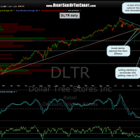 here are the updated daily and weekly charts on the DLTR short trade, which was recently triggered on a break below the 4 year uptrend line. since that short trigger, we saw DLTR spike back up to re-test both the multi-year uptrend line as well as the new downtrend line that originates from the all-time (and probably for a long while) high in DLTR put in on june 20th. i currently favor T3 on this trade but wanted to point out the fact that T1 may be hit soon, for those wishing to take partial or full profits at that target.