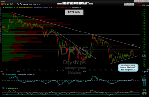 several of the shipping stocks have fallen back below their recent breakout levels, which may have triggered some tight stops for more active traders. for those longer-term traders that entered a position on the recent DRYS breakout and planned to give their stops more room to adjust for a higher profits target, i’ve added what looks to be an important technical level for the stock to hold on any pullback. for tracking purposes, i will considered this trade stopped out on a solid break below this level.
