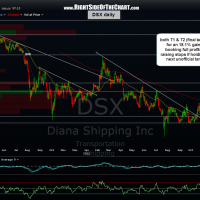 the DSX long has hit both T1 & T2 (final target) today for an 18.1% gain. it took a while as this trade officially triggered a long entry on the breakout back on Sept 19th (at 7.18) and just floundered around since then, above the suggested stop levels, finally moving up sharply with the other shipping stocks recently. as T2 was the final target, DSX will be moved to the completed trades category. however, for longer-term traders & investors who are bullish on the stock or shipping sector, the next unofficial target is that horizontal line at the 10.30 area. consider raising stops to just below the former T1 area if holding out for additional gains. charts in order as posted.
