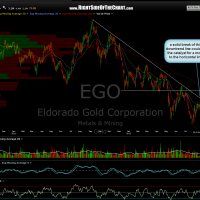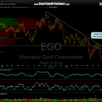 well, this is both an update to notify of the breakout on the EGO long setup as well as notification that the (sole) target was hit. not sure if anyone was quick enough to catch it but EGO did trigger a long entry on the open by gapping above the downtrend line. the stock opened at 12.25, which still allowed an objective entry and then ripped straight up to hit the target line (12.77), providing a modest but quick 4.2% gain. i do not think the R/R warrants remaining long on this one so it will be moved to the completed trades category. charts below: