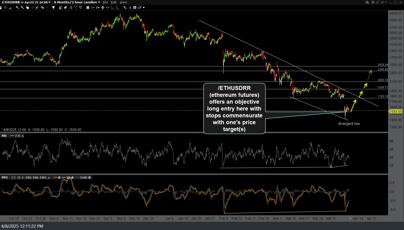 Should /ETHUSDRR continue to rally up to my final target zone from April 8th (now about 2350-2480 on the May contract) and/or the downtrend line that comes in just below, that would also offer an objective short entry or add-on to a starter position taken here.