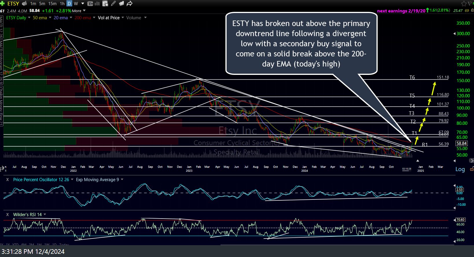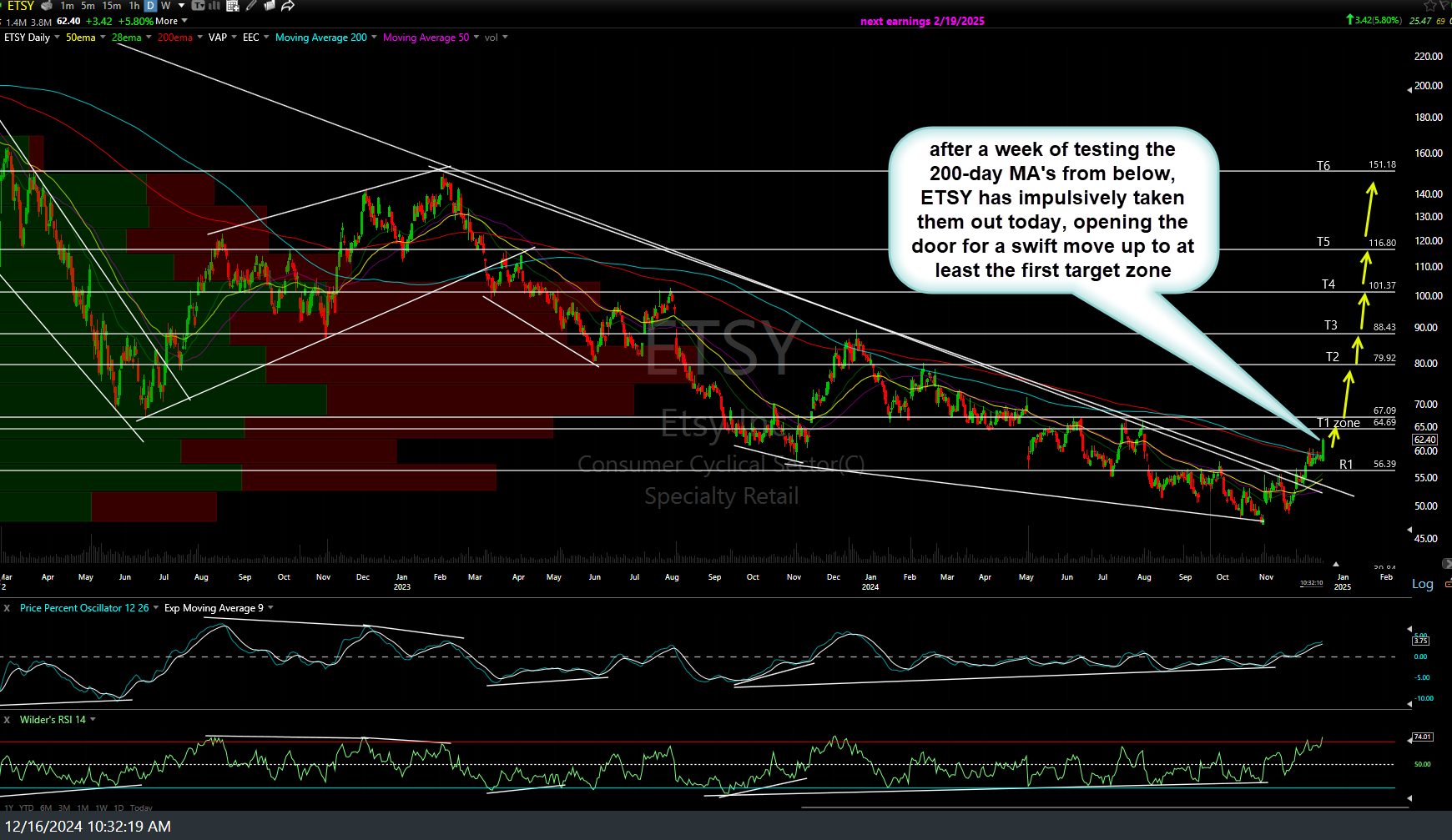 After a week of testing the 200-day MA’s from below, the ETSY (Etsy Inc.) swing trade has impulsively taken them out today, opening the door for a swift move up to at least the first target zone. Previous (Dec 4th) & updated daily charts below.