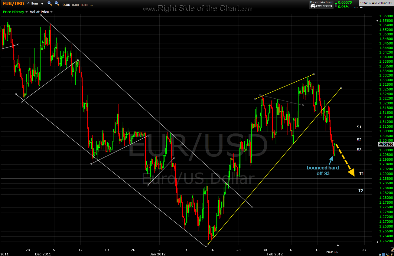 technical analysis working perfectly so far. here’s a zoom-in of the EUR/USD 4 hr chart (last one) as well as the previous one’s in order. as said a couple of days ago, S1-S3 were minor support levels that i didn’t expect much of a reaction off of and being that we basically sliced thru the first two levels without any consolidation or bounce to alleviate short-term oversold conditions, it is only natural that the EUR/USD bounced pretty hard as soon as it hit T3 a couple of hrs ago. now that it’s bounced back to S2 (support, once broken, now equals resistance) i’d put the odds that the EUR/USD will turn back down soon and therefore, i’m going to scale a little more into some short positions here on the spike in the equities/futures that the EUR/USD bounce off support has sparked.