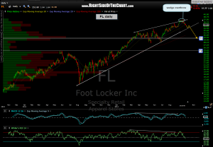 i have made another slight revision to the FL price targets, moving T1 slightly higher to more accurately reflect where i think prices might find the first key support area once/if the bearish rising wedge pattern breaks down. FL is an active short that was originally posted with two entry criteria: 1) at the top of the wedge in anticipation of the wedge breakdown and/or 2) on a break below the bottom of the wedge.