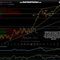 In trying to determine how far this market bounce will go, it helps to follow the leader. This 5 minute chart of AAPL shows a nearly identical bullish falling wedge pattern to the one that I showed earlier on the QQQ (not a surprise with AAPL so top heavy in the Q’s) and I have listed both my initial target zone as well as an uppermost target that would actually play out very nicely when I zoom back out to the daily chart. As you can see below, my uppermost target is at the 574.75 area. Coincidentally (or not), AAPL has multiple recent gaps around that level on the daily chart. Add to that, the 200ema has done a good job of acting as support on AAPL for at leas the last couple of years and that key MA is starting to turn down and should come in at right around the 574.75 level if prices were to move there within the next few sessions. In fact, I may even decide to take my QQQ longs home over the weekend, depending on how the rest of the day unfolds.
