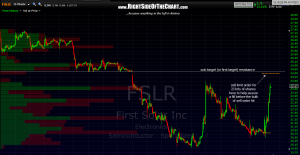 i normally don’t post my day-trades as the majority of traders, at least on this site, are swing traders (1+ day time horizon) but every now & then i might actively post how i’m trading a specific trade for educational purposes. keep in mind that a momentum trade like FSLR can turn on a dime at anytime so best to trail up your stops to protect profits and at the very least, move them up to entry once the trade has moved up this much. i’ll plan to do a post in the near-future on how to adjust your position size for day-trade but for now, here’s a 15 min chart zooming in on that sub-target that i added to the last 30 min chart.