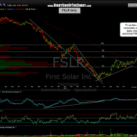 FSLR has now hit the first target of 29.50 for a 25.5% gain from entry so consider taking partial or full profits and/or raising your stop, depending on your trading plan. Also note that I have made an adjustment to T2, now 39.10. This trade was based off the 4-hour period chart, which has been updated below but I have also included the daily chart which shows some additional targets for longer-term traders. In fact, these are the same targets that were listed on the previous FSLR long trade which was closed out for a 55% gain back on August 7th. Although I do expect a pullback from at or near current levels, longer-term traders who are bullish on FSLR and the markets might target T4 which would be my final long-term target if FSLR continues to move higher.