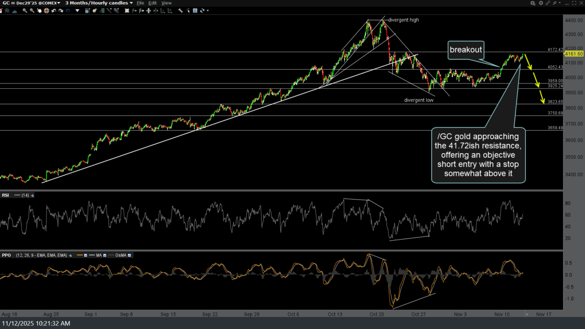 /GC (gold futures) previous & updated 60-minute charts for futures traders below, with /GC now approaching that 41.72ish resistance following the recent break above the trading range, thereby also offering an objective short entry with a stop somewhat* above it.