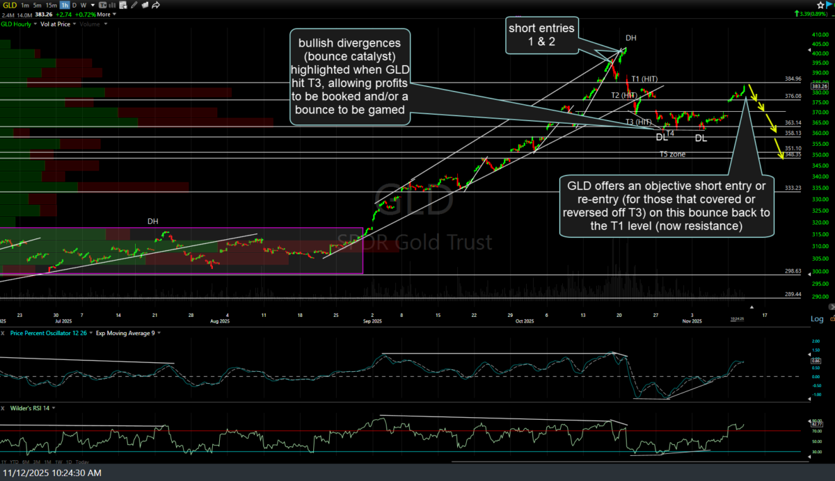 GLD (gold ETF) offers an objective short entry or re-entry (for those that covered or reversed off T3) on this bounce back to the T1 level (now resistance) with stops somewhat* above it. Previous & updated 60-minute charts below.