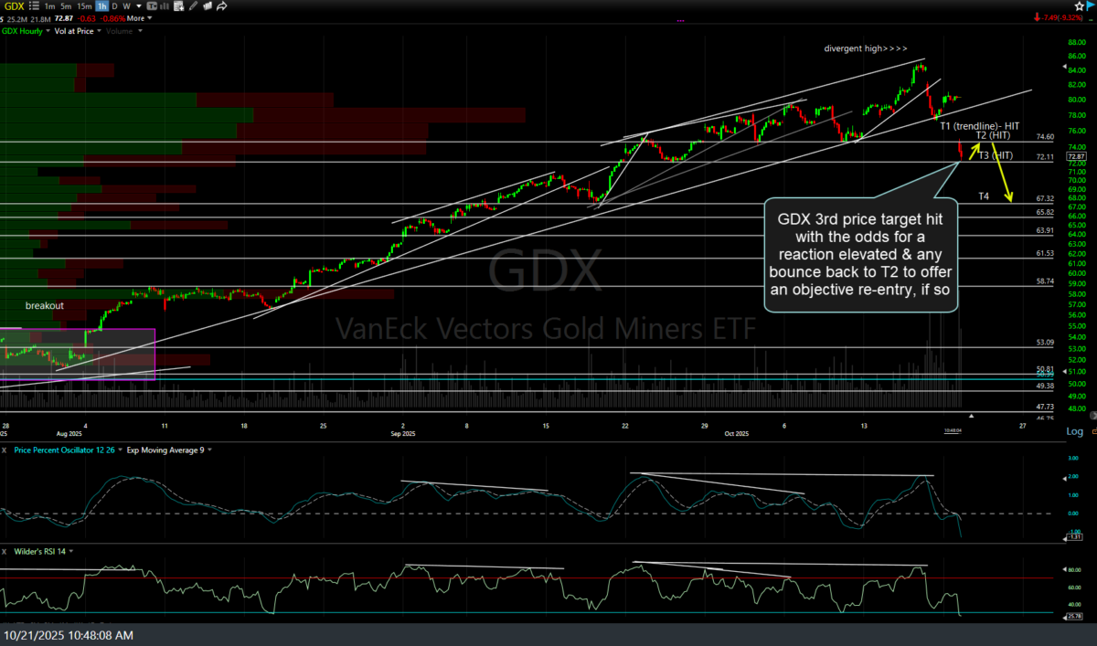Likewise & far from mere coincidence, the GDX (gold miners ETF) short trade has just hit the third price target (T3) for a quick 11% profit, where the odds for a tradable bounce are also favorable, before the next leg down. Previous & updated 60-minute minute charts.