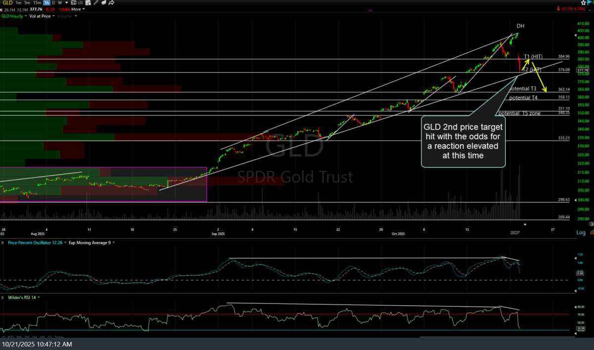 The GLD (gold ETF) short swing trade has just hit the 2nd price target (T2), with the odds for a reaction elevated at this time (i.e.- active traders might opt to cover short & reverse to long to game a bounce… gold bug bulls could use this as a level to enter or add to longs with stops somewhat below). Previous & updated 60-minute charts below.