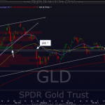 of course, a bounce to resistance is not in-itself automatically a reason to short. using other indicators and time-frames will help determine if prices are likely to pull-back from that support or bust through it. my opinion on a pullback is not very strong at this point, however, i do think that the odds favor at least pullback from at or near current levels (possibly a much larger move lower toward my weekly target). being that GLD has a little room to go before actually testing the bottom of that channel, prices could drift higher for a few days before a pullback begins. of course, a lot can and probably will happen over the next few days, both in stocks and gold so either a quick hit-n-run strategy for the nimble traders or continuing to keep things light for now might just be the best strategy for the time being. i will always continue to post both bullish and bearish candidates as i see them, regardless of my own personal views or bias on the market (and please… don’t ever believe a trader who tells you that he/she trades the market without any bias, unless you are talking to one of Goldman Sach’s HFT computers….).