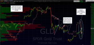 i’ve adjusted the most recent arrows noting the divergence to closer reflect the gap down in the FXE today, since the candlestick chart of GLD prices shows the gap while the FXE line does not (the arrows now both originate from the same starting point in time). the divergence still clearly exists as GLD did gap down in-line with the gap in FXE (although not as much as one would have expected based on past price moves), however, FXE has continued to sell lower since the open while gold has actually ripped higher since the open (continuing the divergence). bottom line remains that the odds higher favor a reversion to the correlation very soon, either by GLD down, FXE up or both.