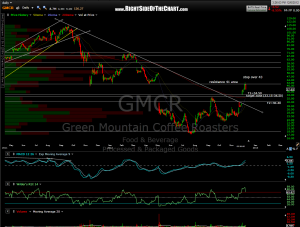 GMCR (Green Mountain Coffee Roasters) is on the receiving end of getting roasted today, currently down 9% from the short entry yesterday. Although I still prefer the target at 34.50 posted yesterday, I have updated the daily chart to reflect a first target zone that runs from that level down to 33.15 for those who might want to skim a little more cream off this trade. I’ve also added a second potential target at 30.40 (T2) but will most likely remove this trade if & when T1 is hit unless the broad market starts to giddy up on the downside soon. Also consider lowering your stop to entry at this point to assure at least a breakeven on the trade.