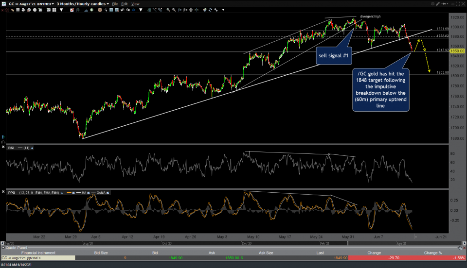 /GC (gold futures) has hit the 1848 target following the impulsive breakdown below the (60-minute) primary uptrend line where a reaction is likely & the 1876ish resistance a potential & fairly likely bounce target.